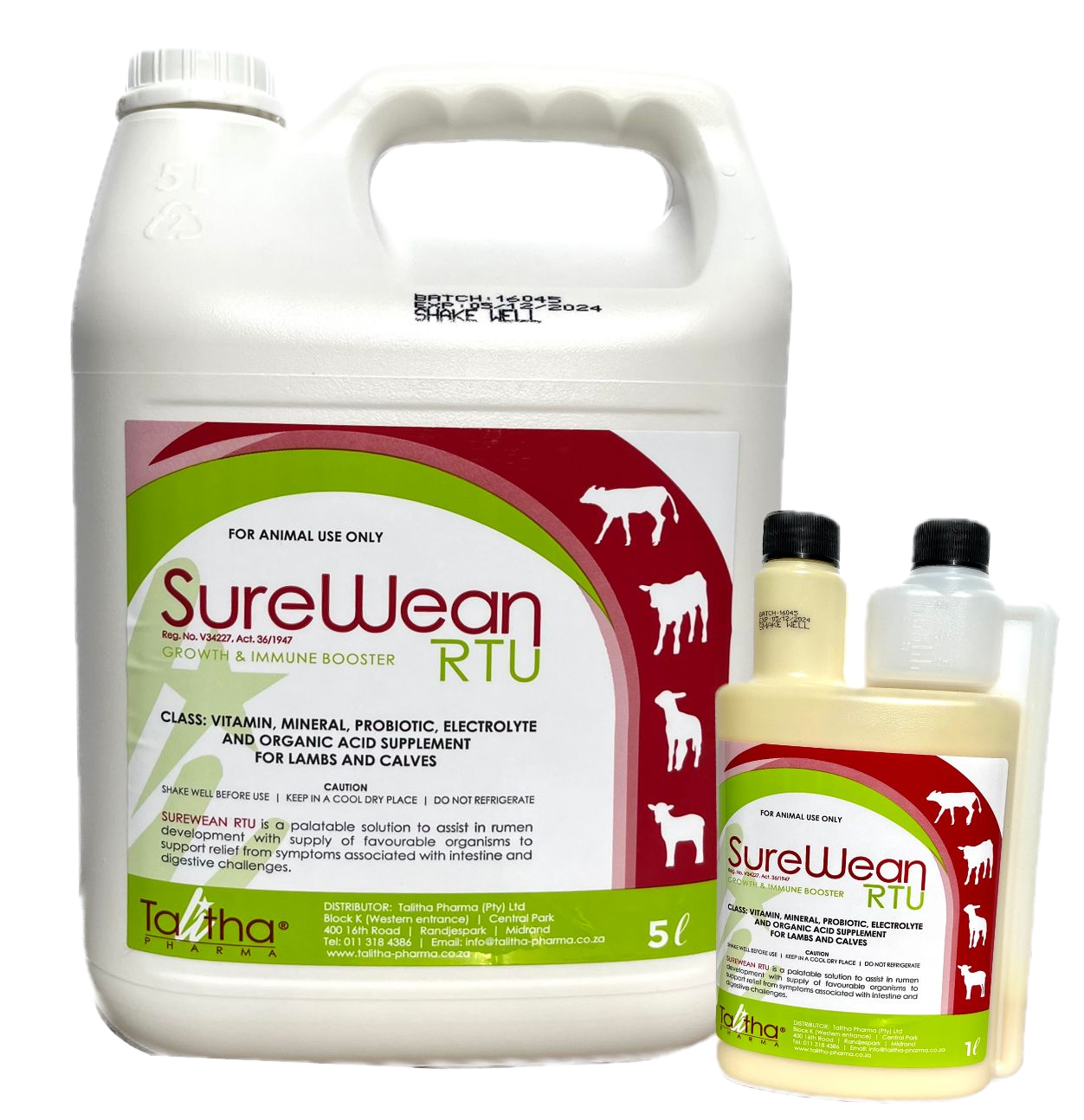 GROWTH & IMMUNE BOOSTER SureWean RTU is a palatable solution to assist in rumen development with supply of favorable organisms to support relief from symptoms associated with intestine & digestive challenges, such as diarrhoea associated with E. coli, Salmonella, Clostridia, diarrhoea and constipation associated with coccidia